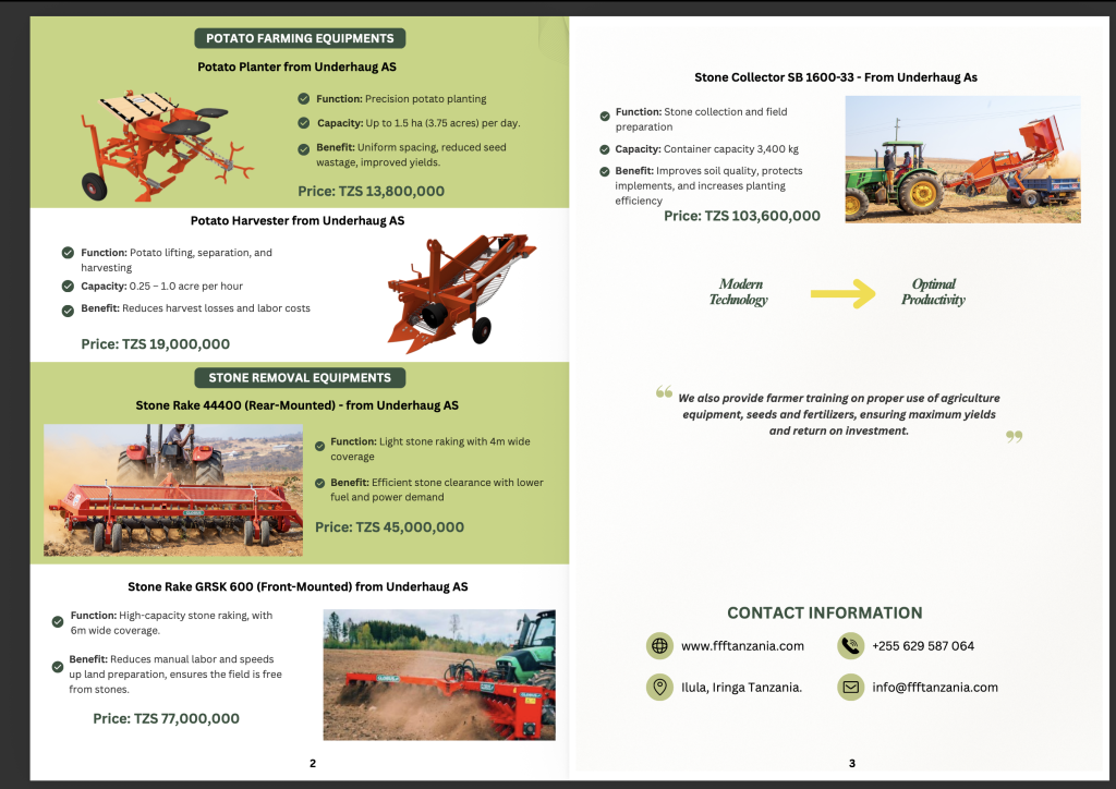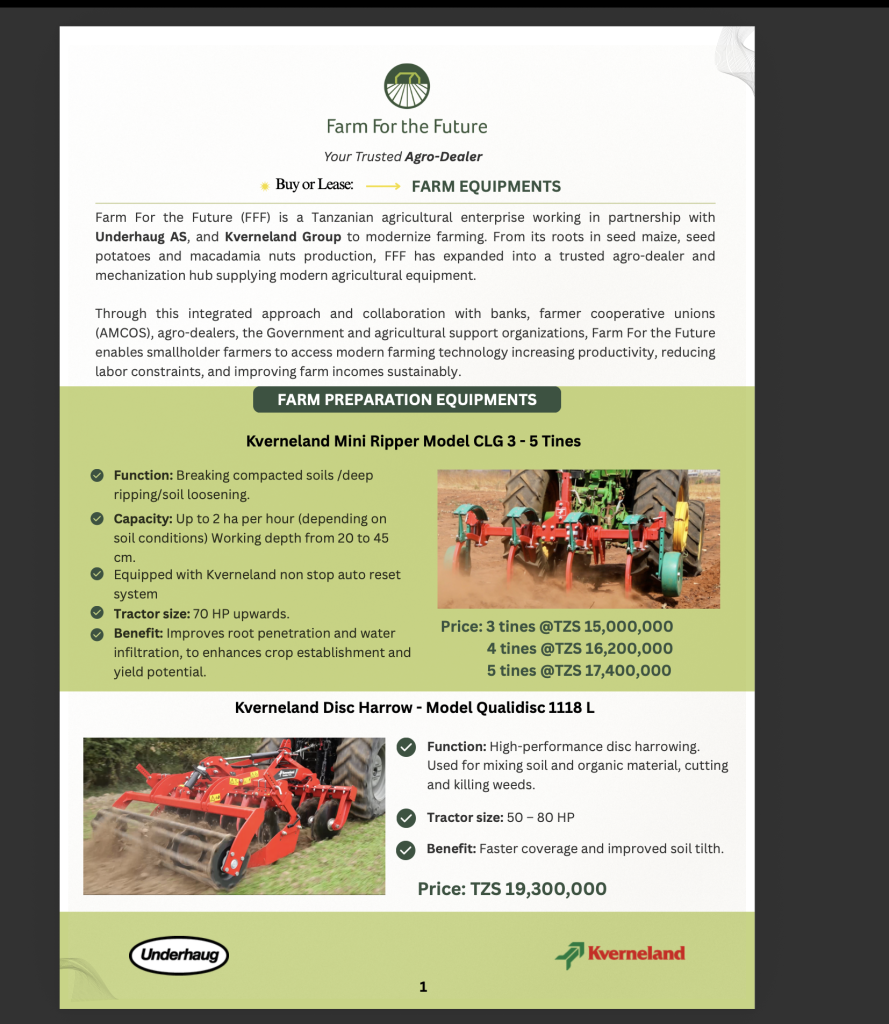 Farm For the Future, known by its initials FFF, is working in partnership with Underhaug AS and Kverneland Group, two established names in European agricultural equipment manufacturing, to make modern farming machinery accessible to Tanzanian smallholders, farmer cooperative unions, and agro-dealers. The company’s product range covers farm preparation, potato farming, and stone removal, and is priced in Tanzanian shillings.
