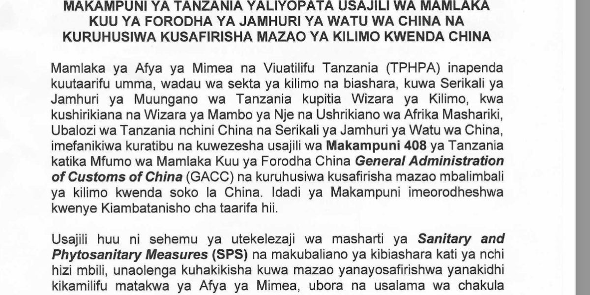 The approval follows sustained diplomatic and technical engagement between Tanzania’s Ministry of Agriculture, the Ministry of Foreign Affairs and East African Cooperation, Tanzania’s Embassy in China, and Chinese regulatory authorities—a coordinated effort spanning multiple bilateral forums and technical working groups.